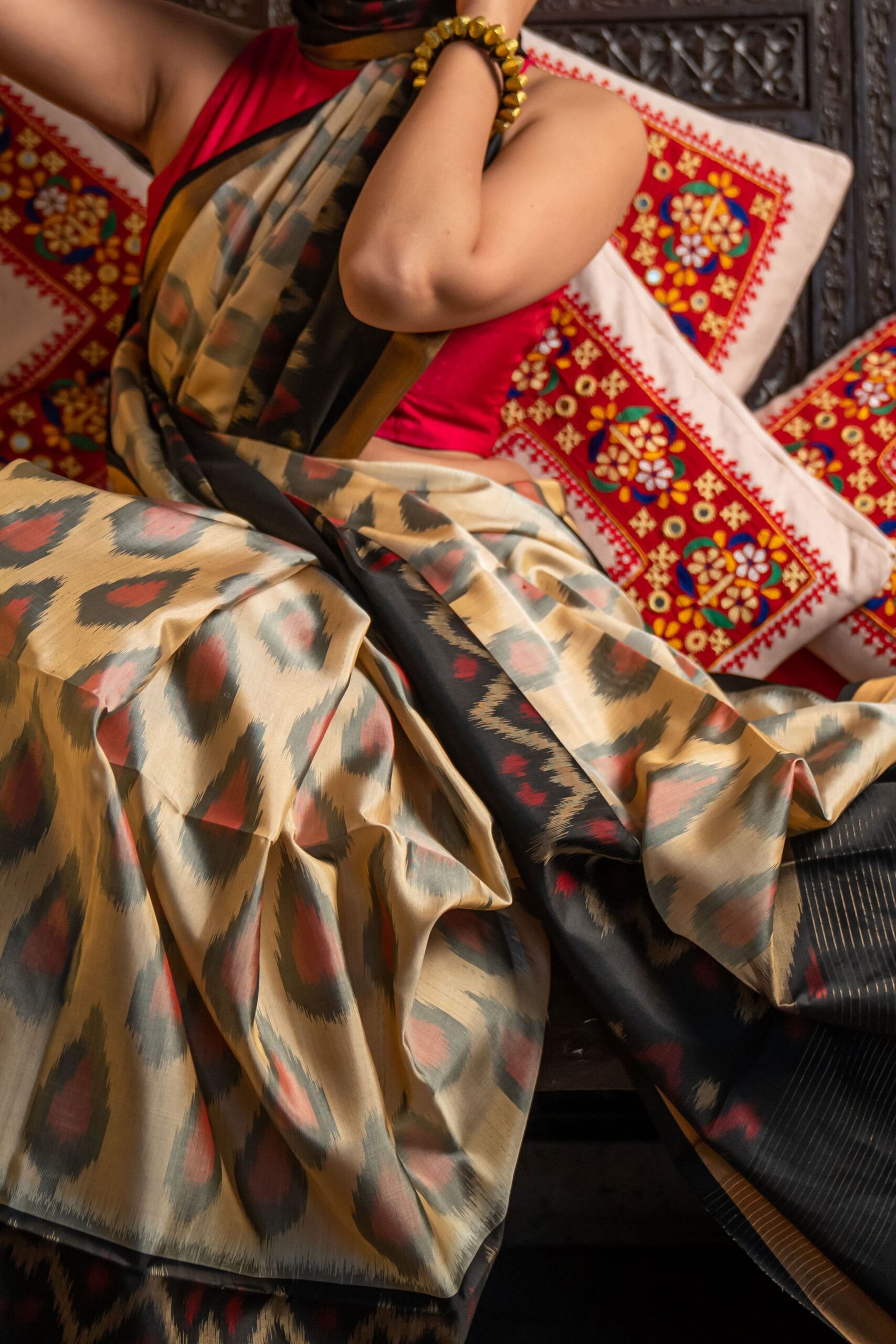 Pastel Beige and Black ikkat pochampalli pure silk saree